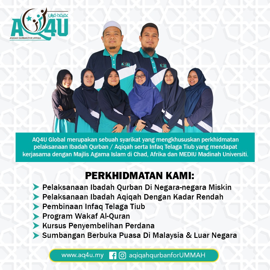 Sebelum itu, izinkan saya berkongsi sedikit info perihal syarikat kami😊. 📌 *Aqiqah Qurban For Ummah (AQ4U Global)* merupakan Badan Amal yang telah melaksanakan Qurban sejak 2016 & 2017 lagi atas nama Badan-Badan Kebajikan Islam. Selain qurban, terbuka juga bagi Infaq Telaga. 📌Kami mendapat kerjasama dengan MAJLIS AGAMA ISLAM CHAD dan juga NGO Islam di Chad seperti Yayasan Al-Huda dan Yayasan Al-Birr. 📌Dan kini membuka peluang di Kyauktaw, Myanmar (penempatan etnik Rohingya) bagi melaksanakan ibadah Aqiqah. 📌Jadi bermula pada tahun ini kami melaksanakannya atas nama *AQ4U Global* yang diuruskan dan diterajui oleh : *1. Ustaz Muhammad Hirman Mukhtar (B.A. Al Azhar)* *2. Ustaz Abdul Halim Othman (B.A. Al Azhar)* 📍Syarikat kami kini terletak di Tingkat 1, No. 32, Jalan Sesama, Kawasan Perindustrian Ringan Sri Gombak, 68100 Batu Caves, Selangor.